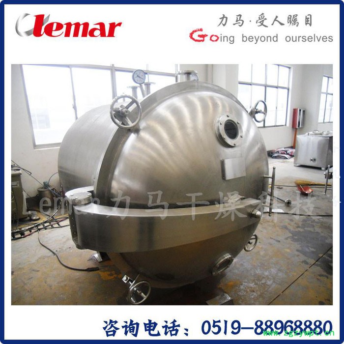 该干燥机罐体中间为圆柱形,两端为圆锥形,圆锥顶部设进、出料口(兼作人孔)、罐体内、外共分三层,中间夹套加热介质可以是蒸汽或循环热水,保温层为中碱超细玻璃棉,耗能极少;内层投放物料,在真空条件下回转干燥,物料边翻动边通过器壁获取热量,加速干燥,这样避免了热敏性物料在干燥时表面返黄的现象,并大大缩短了物料干燥时间,仅为同类物料在真空烘箱内所需干燥时间的2/3左右,提高了劳动生产率;特别适用于易氧化和易燃、易爆的物料和热敏性物料的干燥;在要求不破坏品形的物料、严格限制金属离子的物料以及要求排出挥发物(或有毒物质)须回收(或破坏毒性)的物料,则更能显示出它的优越性。