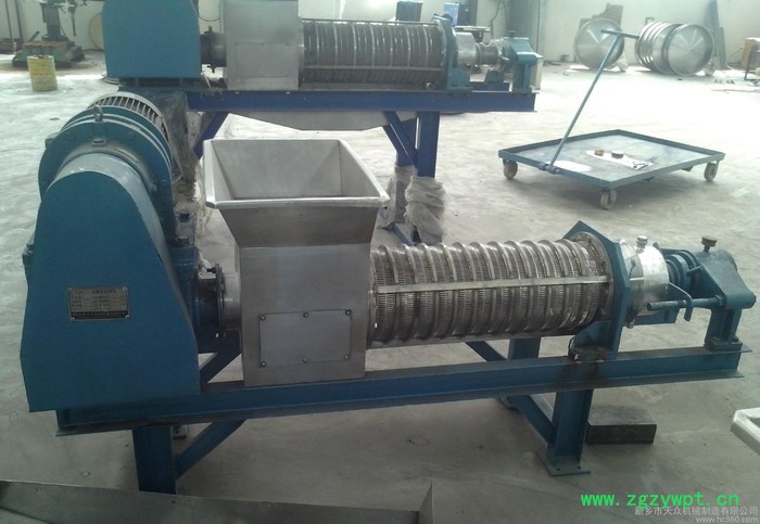 待处理的物料经过泵等工具均匀地输送到螺旋压榨机进料口,经过螺旋叶片挤压和筛网的过滤,水或者汁液经过筛网流到机器下面的接水盘收集后经过管路接走。分离出的固体从后端排出。不同的物料选用不同的筛网(孔径0.1-1mm)、不同的螺旋转速以及适当调整出渣口干湿调节装置来达到**的产量以及渣的干湿程度(或者说通过调整出渣口干湿调节装置以及适当螺旋转速来达到脱水效果和产量的**配合)------含纤维越高,产量越大,脱水后的渣干度也越高;筛网孔径越小,处理的物料的颗粒直径也越小。