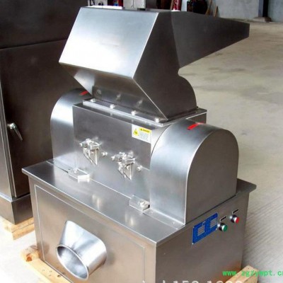 本粉碎机为卧式可倾翻粉碎结构,主要由底座、电机、粉碎室、盖及加料斗组成,加料斗及盖可倾翻一定角度,便于清除粉碎室内的存料及修理。物料由粉碎机料斗进入粉碎室,利用旋转刀与固定刀冲击、剪切而获得粉碎,经旋转离心力的作用,物料自动流向粉碎机出口处。该机按“GMP”标准设计,本粉碎机全部采用不锈钢材料制造,结构简单、清洗方便、噪音低、目前是粗粉碎中最理想的设备。