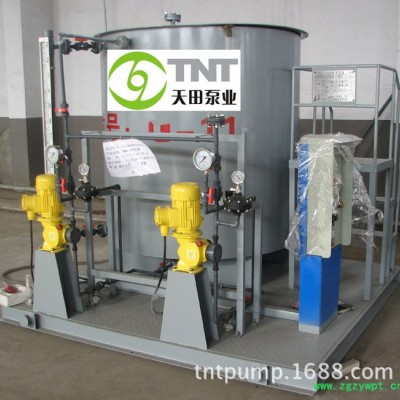 加药装置由溶液箱、计量泵、液位计、安全阀、脉动阻尼器、各类阀门、管道、电气控制柜等组成,安装在同一个钢制底座上,实现溶配药液、计量和投加功能的整体组合,具有结构紧凑、占地面积小、易于运输、安装等特点。也可根据用户加药间空间要求设计成各种形状。