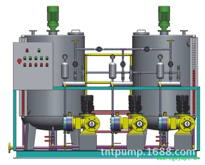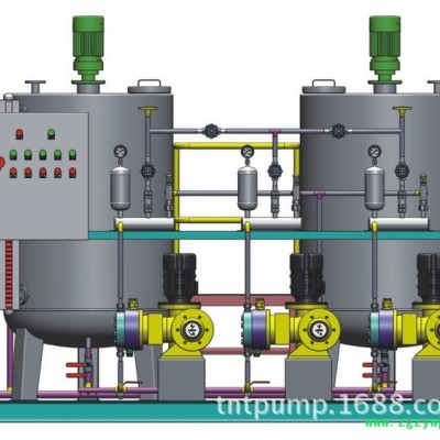 装置上的计量泵可根据需要,任意设定工作泵和备用泵;如有两个以上溶液箱,经过阀门切换,溶液箱可交替单独使用,也可同时使用。