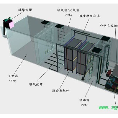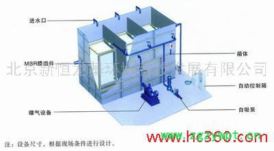 该系统不但将水处理合格的同时,还针对目前中水处理站普遍存在的噪音、废气等二次污染问题,.MBR一体化中水处理设备同样都给予了很好的处理。中水站的主要噪音源(如鼓风机等)都集成在一体化设备内,整个设备采用专有的消音技术进行了消音结构设计,使得噪音对周围环境的影响降到规范要求;对于调节池与生化反应池产生的废气一方面进行有组织排放,使站内的空气质量得到良好保证,另一方面可增加废气的臭氧处理单元,使废气经过消毒后安全排出室外**一步还体现在,该工艺系统还对所用设备选型时进行了节能优化设计,使得MBR一体化中水处理设备的总装机与运行功率的能耗大为降低。 膜生物反应器法设备示意图