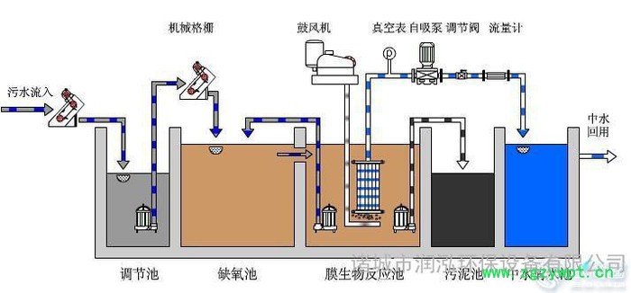 以膜组件取代传统生物处理技术末端二沉池,在生物反应器中保持高活性污泥浓度,提高生物处理有机负荷,从而减少污水处理设施占地面积,并通过保持低污泥负荷减少剩余污泥量。主要利用沉浸于好氧生物池内之膜分离设备截留槽内的活性污泥与大分子有机物。膜生物反应器系统内活性污泥(MLSS)浓度可提升至8000~10,000mg/L,甚至更高;污泥龄(SRT)可延长至30天以上。膜生物反应器因其有效的截留作用,可保留世代周期较长的微生物,可实现对污水深度净化,同时硝化菌在系统内能充分繁殖,其硝化效果明显,对深度除磷脱氮提供可能。2用途 污水处理:中国是一个缺水国家,污水处理及回用是开发利用水资源的有效措施。污水回用是将城市污水、工业污水通过膜生物反应器等设备处理之后,将其用于绿化、冲洗、补充观赏水体等非饮用目的,而将清洁水用于饮用等高水质要求的用途。城市污水、工业污水就近可得,可免去长距离输水,而实现就近处理实现水资源的充分利用,同时污水经过就近处理,也可防止污水在长距离输送过程中造成污水渗漏,导致污染地下水源。污水回用已经在世界上许多缺水的地区广泛采用,被认为21世纪污水处理最实用技术。进出水水质比较:一般城市污水设计进水水质:BOD5<300mg/l ;CODcr<500mg/l ;SS<300mg/l ;T-N<45mg/l出水水质:BOD5<10mg/l ;NH4+-N<10.0mg/l; CODcr〈30mg/l ;浊度<5NTU;总大肠细菌总数<3个/L ;