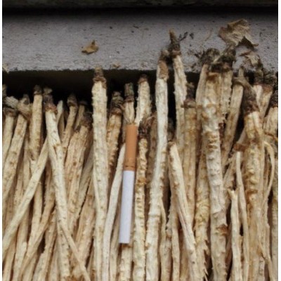 【药材】干燥根呈细圆柱形或直条状,两头较细,很少有分歧,长15~30厘米,直径3~8毫米。外表淡黄色,粗糙,具纵纹及未除尽的棕黄色栓皮,并有棕色点状的支报痕迹,顶端往往残留圆柱状的根茎。质硬而脆,易折断。断面不整齐,淡黄色,中央有黄色放射状的木质部,形成层呈圆环状,深褐色。气微,味甘。