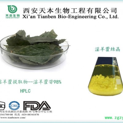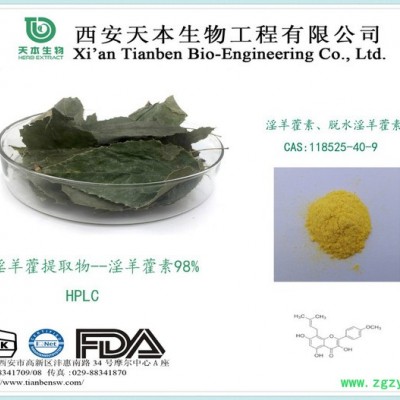 产品来源:小檗柴科植物Epimedium brevicornum Maxim、箭叶淫羊藿Epimedium sagittatum (Sieb.et Zucc.) Maxim.、柔毛淫羊藿Epimedium pubescens Maxim.、巫山淫羊藿Epimedium wushanense T.S.Ying、或朝鲜淫羊藿Epimedium koreanum Nakai干燥茎叶提取物