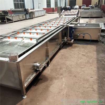 原理:机器工作时由于调速电机通过传动部分带动网向前输送,同时在鼓泡和后部射流推进器的共同作用下,使得物料在水中翻滚震动从而达到清洗果蔬的目的,再由网带把物料提升出水面进行净水喷淋,将物料外表的循环水喝泡沫冲洗干净,污水及漂浮的杂质经小水箱过滤后循环利用,比重较大的杂物则沉入大水箱底部,清理时由排污口排出。