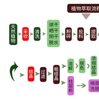 【工艺流程】:原料→筛选→粉碎洗涤→投料→用水提取纯化→提取液→过滤→浓缩→浸膏→干燥→粉碎→过筛→混合→检测→包装→产品