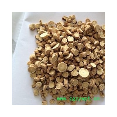 本品为浅黄色圆片状,表面浅黄色,断面浅黄色,味甘,性微温,归肝、脾、肺、肾经。