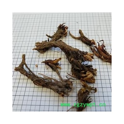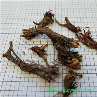 【药材性状】本品略呈圆锥形,多弯曲,长5~18cm。根茎短小,上端有茎、叶残基,呈狭长的膜质片状或纤维状。外层黑棕色,内层棕色或黄色。根单一或数条交结、分枝或并列,直径0.3~lcm。表面棕褐色,皱缩,有细根及须根。质松脆,易折断,断面粗糙,皮部深棕色,常成裂片状,木部黄白色。气特异,味苦而辛,有清凉感
