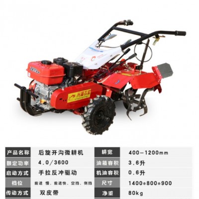 本机安装上不同的配件可以开沟、起垄、培土、除草、施肥、 开深沟、施底肥、埋葡萄藤、扶垄等,与其他单一功能的田园管理机是不同的。