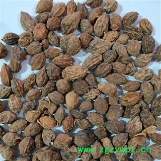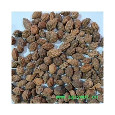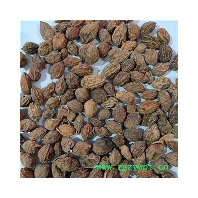 性状:本品呈椭圆形,两端略尖,长1.2~2cm,直径1~1.3cm。表面棕色或灰棕色,有纵向凹凸不平的突起棱线13~20条,顶端有花被残基,基部常残存果梗。果皮薄而稍韧,与种子紧贴,种子集结成团,中有隔膜将种子团分为3瓣,每瓣有种子6~1l粒。种子皇不规则的扁圆形,略有钝棱,直径约3mm,表面灰褐色或灰黄色,外被淡棕色膜质的假种皮;质硬,胚乳白色。有特异香气,味辛、微苦。