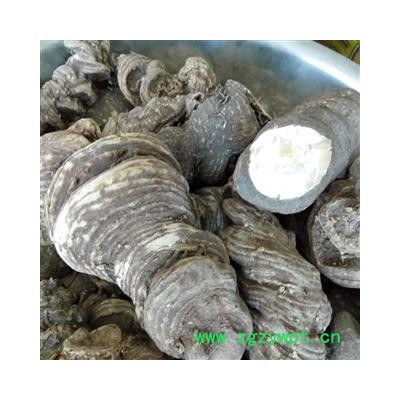 [性 状]:本品呈结节状扁圆柱形,略弯曲,长5~12cm,直径1.0~4.5cm。表面黄棕色或灰棕色,外皮脱落处呈白色;密具层状凸起的粗环纹,一面结节明显,结节上具椭圆形凹陷茎痕,另一面有疏生的须根或疣状须根痕。顶端具鳞叶及茎的残基。质坚实,断面平坦,白色至浅棕色,粉性或角质。无臭,味微苦、麻。