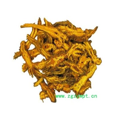 【性状】多集聚成簇,常弯曲,形如鸡爪,单枝根茎长3~6cm,直径0.3~0.8cm。表面灰黄色或黄褐色,粗糙,有不规则结节状隆起、须根及须根残基,有的节间表面平滑如茎秆,习称“过桥”。上部多残留褐色鳞叶,顶端常留有残余的茎或叶柄。质硬,断面不整齐,皮部橙红色或暗棕色,木部鲜黄色或橙黄色,呈放射状排列,髓部有的中空。气微,味极苦。