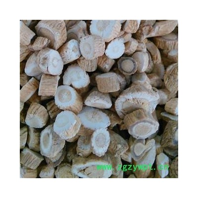 【性状】 本品呈圆柱形,稍扭曲,长10~20cm,直径0.5~1cm.。表面淡灰黄色或淡棕黄色,有纵皱纹、横长皮孔样突起及支根痕。根头略膨大,可见暗绿色或暗棕色轮状排列的叶柄残基和密集的疣状突起。体实,质略软,断面皮部黄白色,木部黄色。气微,味微甜后苦涩。