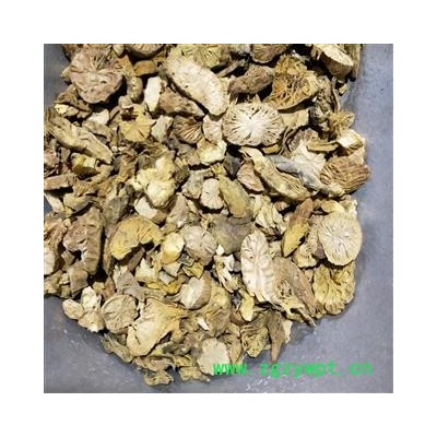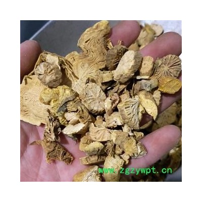 【性状】本品呈不规则圆块状,长5~10cm,直径3~6cm。表面棕黄色或淡褐色,粗糙不平,有深皱纹。质坚硬,不易击碎、破开,横断面淡黄白色,导管束略呈放射状排列,色较深。气微,味苦。