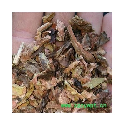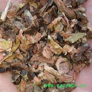 【性状】 本品根茎呈圆柱形,粗短,略弯曲,少数有分枝,长5~20cm,直径2.9~4.5cm。表面棕色或褐色,粗糙有褶皱,剥开外表皮有一层膜质黄色表皮且具粉红色花纹;宿存部分老花茎,花茎基部被三角形或卵形膜质鳞片;节间不规则,断面粉红色至紫红色,有一环纹,质轻,疏松。主根呈圆柱形,粗短,长约20cm,上部直径约1.5cm,侧根长10~30cm;断面橙红色或紫红色,有时具裂隙。气芳香,味微苦涩、后甜。