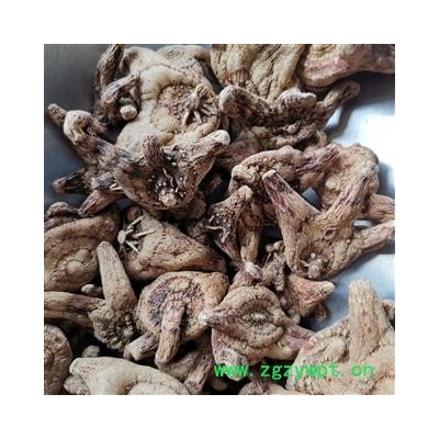 性 状:该品呈不规则扁圆形,多有2~3 个爪状分枝,长1.5~5cm,厚0.5~1.5cm。表面灰白色或黄白色,有数圈同心环节和棕色点状须根痕,上面有凸起的茎痕,下面有连接另一块茎的痕迹。