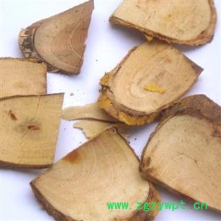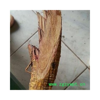 皮黄色或橙红色,具显着的纵皱纹及少数须根痕。栓皮薄而易脱落。质地坚硬,不易折断,断面皮部薄,灰黄色,具韧性纤维,木部占绝大部分。黄色,柴性,导管孔明显,有的中央部位有小髓。气微,味淡。