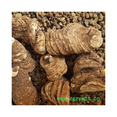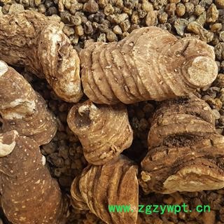 【性 状】呈结节状扁圆柱形,略弯曲,表面黄棕色或灰棕色,外皮脱落处呈白色;密具层状突起的粗环纹,有疏生的须根或疣状须根痕。质坚实,断面平坦,白色至浅棕色,粉性或角质