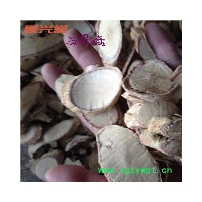 [性 状]:该品圆柱形,长短不一,直径且1.5-2.5cm;或已切成圆形厚片。外皮黄色或橙红色,具显著的纵皱纹及少数须根痕。栓皮薄而易脱落。质地坚硬,不易折断,断面皮部薄,灰黄色,具韧性纤维,木部占绝大部分。黄色,柴性,导管孔明显,有的中央部位有小髓。气微,味淡。