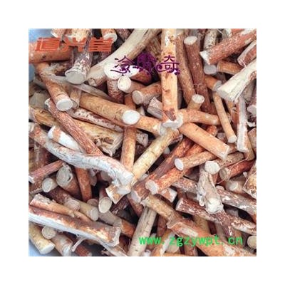 [性 状]:该品根略呈圆柱形,有分枝,长短不一,直径0.2-2.5cm,表面灰棕色或褐色,有纵皱纹,可见明显的横向皮孔及须根痕。部分栓皮脱落后露出黄色皮部。质坚硬,难折断,断面呈纤维性。通常厚1-1.5cm,皮薄,木部呈黄白色,有众多同心环,可见放射状纹理,皮部与木部易分离。气微香,味甘。