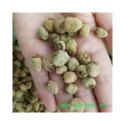 性状: 本品为聚合果,由多数小核果聚合而成,呈圆锥形或扁圆锥形,高0.6~1.3cm,直径0.5~1.2cm。表面黄绿色或淡棕色,顶端钝圆,基部中心凹入。宿萼棕褐色,下有果梗痕。小果易剥落,每个小果呈半月形,背面密被灰白色茸毛,两侧有明显的网纹,腹部有突起的棱线。体轻,质硬。气微,味微酸涩。