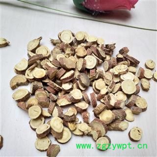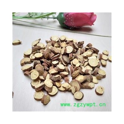 [性 状]:该药材圆形的厚片,表面深红色,切面黄白色或黄棕色,有裂隙或菊花纹,中央有淡黄色圆心。周边淡黄白色置黄棕色,有纵皱纹。有特殊香气,味微甜。