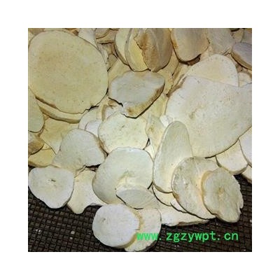 [性     状]:该品呈不规则圆柱形、纺锤形或瓣块状,长8~16cm,直径1.5~5.5cm。表面黄白色或淡棕黄色,有纵皱纹,细根痕及略凹陷的横长皮孔,有的有黄棕色外皮残留。质坚实,断面白色或淡黄色,富粉性,横切面可见黄色木质部,略呈放射状排列,纵剖面可见黄色纵条纹状木质部。无臭,味微苦。