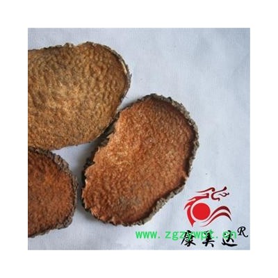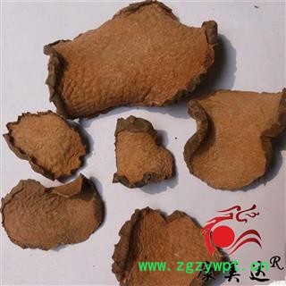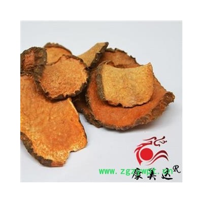 性状:多为横切厚片,圆形或近圆形,直径2.5-7cm,厚0.5-1.5cm。表面棕黑色,皱缩,有众多白色、点状突起的须根痕,或有弯曲残留的细根,栓皮易剥落;切面黄白色至黄棕色,平坦或凹凸不平。质坚脆,易折断,断面颗粒状,并散有橙黄色麻点。气微,味苦。以片大、外皮棕黑色、断面黄白色者为佳。