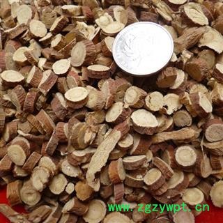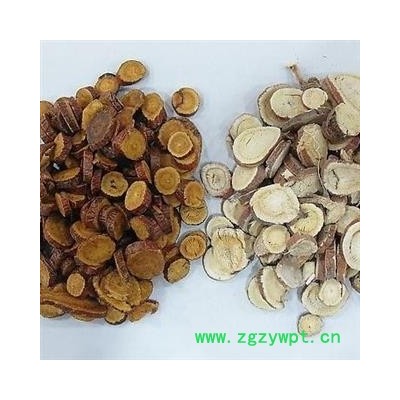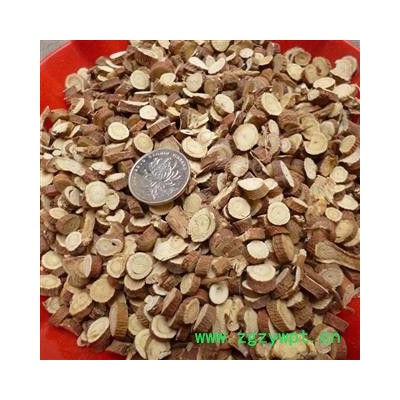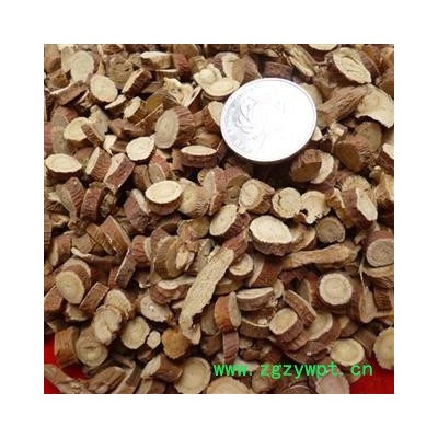 [性 状]:该药材圆形的厚片,表面深红色,切面黄白色或黄棕色,有裂隙或菊花纹,中央有淡黄色圆心。周边淡黄白色置黄棕色,有纵皱纹。有特殊香气,味微甜。