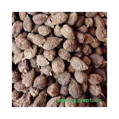 【性状】 呈椭圆形或卵圆形,有不明显的三棱,长1.5~2cm,直径1~1.5cm。表面棕褐色,密生刺状突起,顶端有花被残基,基部常有果梗。果皮薄而软。种子集结成团,具三钝棱,中有白色隔膜,将种子团分成3瓣,每瓣有种子5~26粒。种子为不规则多面体,直径2~3mm;表面棕红色或暗褐色,有细皱纹,外被淡棕色膜质假种皮;质硬,胚乳灰白色。气芳香而浓烈,味辛凉、微苦。