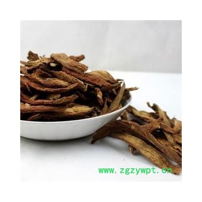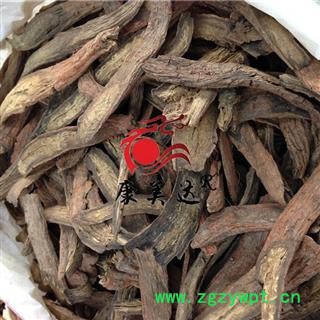 [性 状]:该药材丹参多为带根茎的根,根茎粗短,有茎基残余,下着生多数细长的根。根呈圆柱形,稍弯曲,表面呈砖红色,粗糙,具多数纵沟或皱纹,有须根痕,外部栓皮常鳞片状剥落,皮层有时开裂,长8~22cm,直径5~12mm,质坚脆,易折断,断面不平,疏松有裂隙,皮部棕渴色或砖红色,韧皮部狭。形成层明显,淡棕色,木质部导管束灰黄色或黄白色,放射状排列。气微,味微苦、涩,以条粗壮、色紫红者为佳。