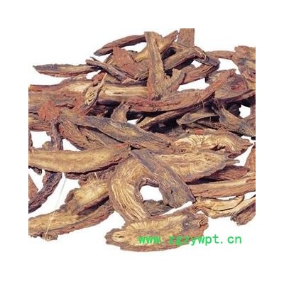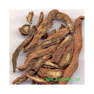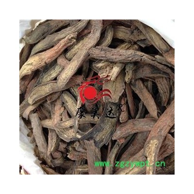 [性 状]:该药材丹参多为带根茎的根,根茎粗短,有茎基残余,下着生多数细长的根。根呈圆柱形,稍弯曲,表面呈砖红色,粗糙,具多数纵沟或皱纹,有须根痕,外部栓皮常鳞片状剥落,皮层有时开裂,长8~22cm,直径5~12mm,质坚脆,易折断,断面不平,疏松有裂隙,皮部棕渴色或砖红色,韧皮部狭。形成层明显,淡棕色,木质部导管束灰黄色或黄白色,放射状排列。气微,味微苦、涩,以条粗壮、色紫红者为佳。