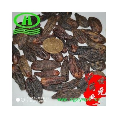 【性 状】表面黑褐色,具有明显的纵皱纹,一端较大,另一端略小,钝尖,下部有果梗痕。质坚硬。断面褐色,有胶质样光泽,果核不明显,常有空心,小者黑褐色,无空心