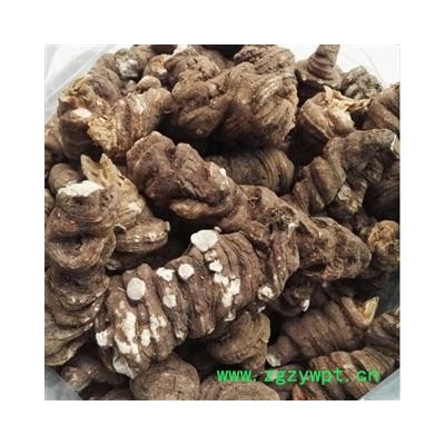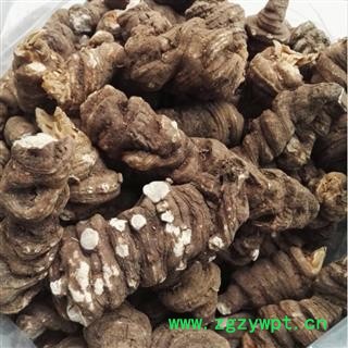 [性 状]:本品呈结节状扁圆柱形,略弯曲,长5~12cm,直径1.0~4.5cm。表面黄棕色或灰棕色,外皮脱落处呈白色;密具层状凸起的粗环纹,一面结节明显,结节上具椭圆形凹陷茎痕,另一面有疏生的须根或疣状须根痕。顶端具鳞叶及茎的残基。质坚实,断面平坦,白色至浅棕色,粉性或角质。无臭,味微苦、麻。