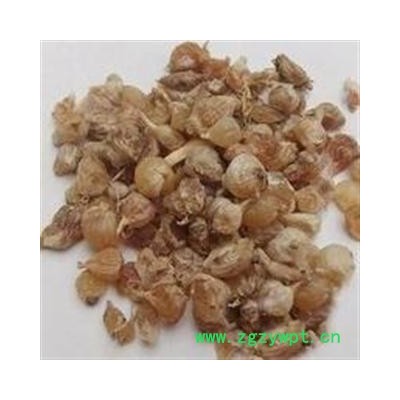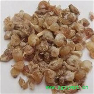 药材性状:呈不规则卵圆形,高0.5~1.5,直径0.5~1.8cm。表面黄白色或淡黄棕色,皱缩,半透明