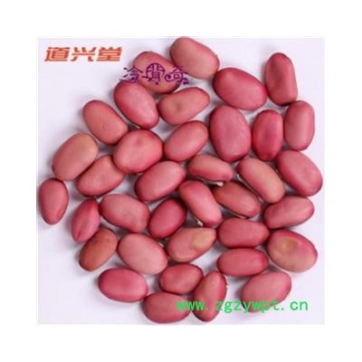 [性 状]:该品干燥种子扁肾形或扁椭圆形,长2.5~3.5cm,宽1~2cm,厚0.5~2cm。表面淡红色或红紫色,略有光泽。边缘有灰黑色线形种脐,长1.5~2cm,宽约2mm,种脐上有白色膜状珠柄残余;近种脐一端有凹点状的珠孔,另端有深色合点,种脐与合点间有隆起的种脊。种皮革质,内表面棕绿色而光亮;子叶两片,黄白色,油润。无臭,味淡嚼之有豆腥气。