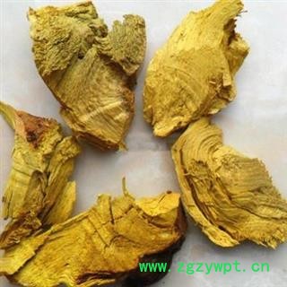 【性 状】呈类圆形,稍扭曲,外皮灰棕色,有细皱纹,昜剥落。质坚硬,切面不平坦,鲜黄色