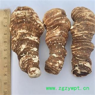 形状、色泽; 圆柱或纺锤形,有不规则纵皱纹及横纹,具碗状茎痕,外皮棕黑色,段切面肉质粉白色。