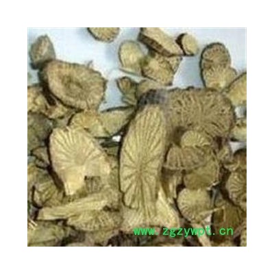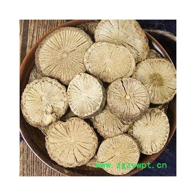 【性状颜色】:为长圆形或不规则的厚片。片面灰黄色或浅灰棕色,木部有放射状纹理,习称车轮纹其间具有多数小孔。髓部淡黄白色,周边绿褐色或棕褐色。体轻,质硬而脆。气微,味苦。