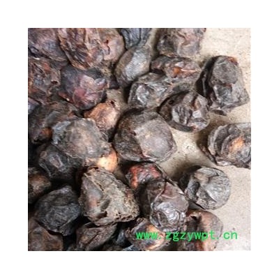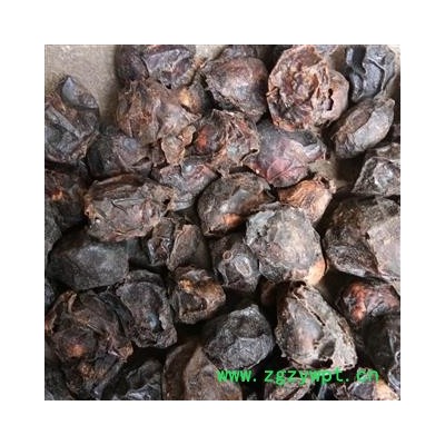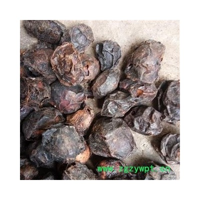 [性 状]:该品呈椭圆形或近卵形,长2~3cm,直径1.4~2cm。表面黑褐色或棕褐色,稍有光泽,具不规则的皱褶,基部有果梗痕。果肉薄,棕褐色,质硬而脆。核近卵形,黄棕色,顶端有5个(偶有4个或6个)明显的小孔,每孔内各含种子1枚。气微,味酸。