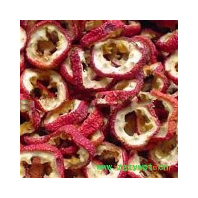 [性 状]:该品圆形片,皱缩不平,直径l~2.5cm,厚0.2~0.4cm。外皮红色,具皱纹,有灰白小斑点。果肉深黄色至浅棕色。中部横切片具5粒浅黄色果核,但核多脱落而中空。有的片上可见短而细的果梗或花萼残迹。气微清香,味酸、微甜。