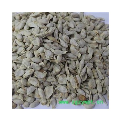 性状:本品略呈卵形,长0.8~1.2cm,直径0.4~0.6cm。表面淡黄白色或淡灰白色,光滑,一侧有种脊棱线,一端钝圆,另端渐尖成小柄状。外种皮薄而韧,内种皮菲薄,淡棕色,子叶2,黄绿色,有油性。气微,味苦。
