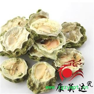 性状:苦瓜干为椭圆形或长圆形片块,厚0.2~0.3厘米,长3~15厘米或过之,宽2~4厘米;切口边缘皮部青绿色,苦瓜干皱缩不平,中间瓤部白色或黄白色,少数红色,柔软而微有弹性,其内嵌生近长圆形而扁的种子5~10枚,种子脱落后常留下孔洞。质略韧,不易断。气微,味苦。以青边、肉白、片薄、种子少者为佳。