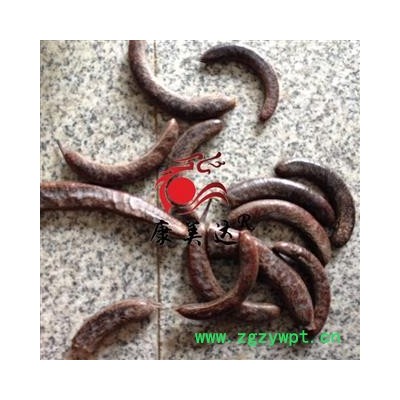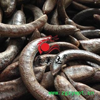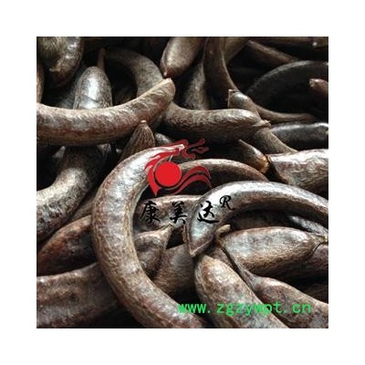 性状:干燥荚果呈圆柱形,略扁,弯曲作镰形,长5~10厘米,宽5~12毫米。表面紫棕色或紫黑色,被灰白色粉霜,擦去后有光泽,并有细小的疣状突起及线状裂纹,腹缝线突起呈棱脊状,背缝线突起不显著而有棕黄色纵纹。先端有喙状的花柱残基,基部有果柄残痕。质硬而脆,易折断,断面外层棕黄色,中间黄白色,中心较软,有淡绿或淡棕黄色的丝状物与斜向网纹,纵向剖开可见排列整齐的凹窝,很少见种子。臭微,有刺激性,嗅其粉末则作喷嚏,味先甜后辣。以个小饱满、色紫黑、有光泽、无果柄、质坚硬、肉多而粘、断面淡绿色者为佳。