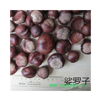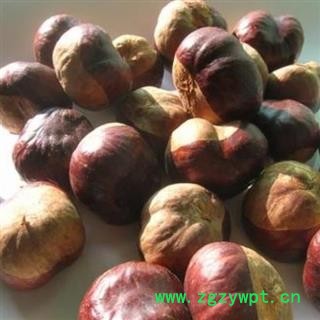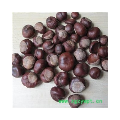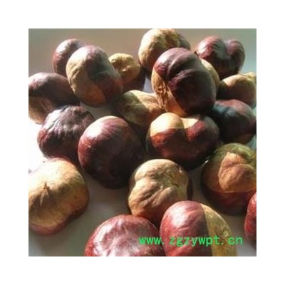 药材性状:本品呈扁球形或类球形,似板栗,直径1.5~4cm。表面棕色或棕褐色,多抽皱,凹凸不平,略具光泽;种脐色较浅,近圆形,约占种子面积的1/2至1/4;其一侧有1条突起的种脊,有的不甚明显。种皮硬而脆,子叶两片,肥厚,坚硬,形似栗仁,黄白色或淡棕色,粉性。无臭,味先苦后甜。