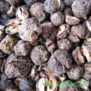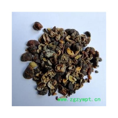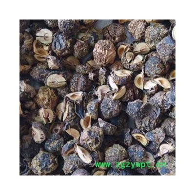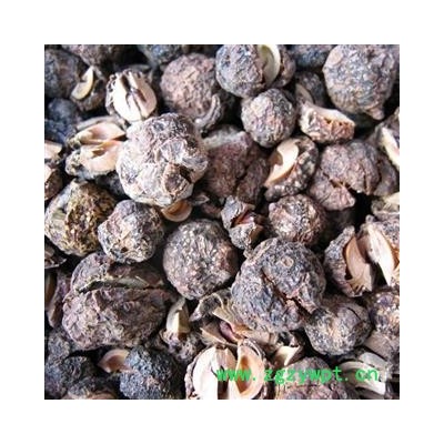 药材性状:果实球形或扁球形,直径1.2-2cm。表面棕褐色至墨绿色,有淡黄色颗粒状突起,具皱纹及不明显的6棱,果梗长约lmm,果肉(中果皮)厚1-4mm,质硬而脆。内果皮黄白色,硬核样,表面略具6棱,背缝线的偏上部有数条维管束,干后裂成6瓣。种子6颗,近三棱形,棕色。气微,味酸涩,回甜。以个大、肉厚、回甜味浓者为佳。