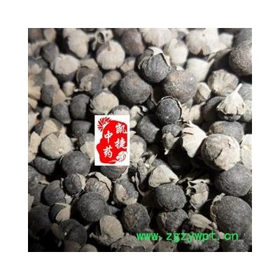 [性 状]:该品果实球形,直径4~6mm。表面灰黑色或黑褐色,被灰白色粉霜状茸毛,有纵向浅沟4条,顶端微凹,基部有灰白色宿萼及短果梗。宿萼长为果实的1/3~2/3,5齿裂,其中2裂较深,密被茸毛。体轻,质坚韧,不易破碎。横切面可见4室,每室有种子1枚。气特异而芳香,味淡、微辛。