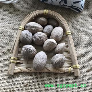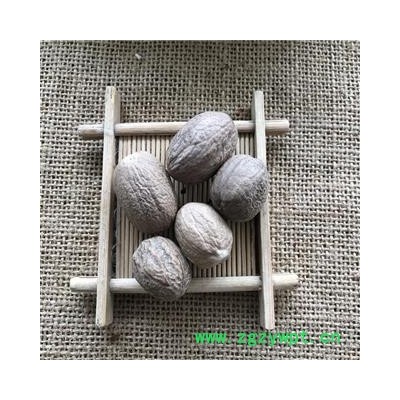 [性 状]:本品种仁卵圆形或椭圆形,长2-3.5cm,宽1.5-2.5cm。表面灰棕色至暗棕色,有网状沟纹,常被有白色石灰粉;宽端有浅色圆形隆起(种脐的部位)。狭端有暗色下陷处(合点的部位),两端间有明显的纵沟(种脊的部位)。质坚硬,难破碎,碎断面可见棕黄或暗棕色外胚乳向内伸入,与类白色的内胚乳交错,形成大理石样纹理。纵切时可见宽端有小形腔隙,内藏小型干缩的胚,子叶卷曲。气强烈芳香,味辛辣、微苦。以个大、体重、坚实、破开后香气浓者为佳。