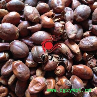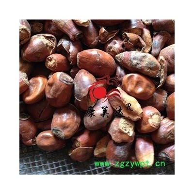 [性 状]:该品种子长圆形或长卵形,稍扁,长1.5-2.5cm。直径0.5-1.5cm。表面棕色至棕红色,稍具光泽,有不规则凹隙和细皱纹;一端平截,有近圆形黄棕色的种脐,直径5-7mm,另一端圆钝。质坚硬,剖开后种皮薄革质而脆;有2片肥厚子叶,橙黄色或棕黄色。气 微,味微甘、苦、涩。以粒大、饱满者为佳。